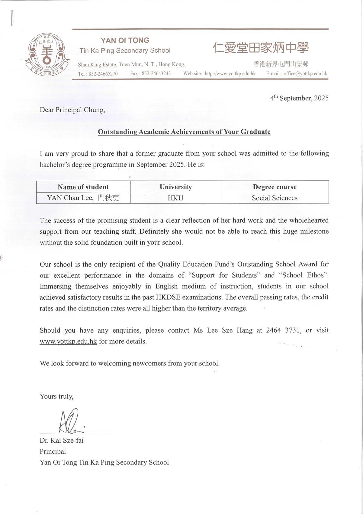 本校有94.4%學生獲派首志願(全港平均 85%)、一條龍及自行收生階段獲學位。
