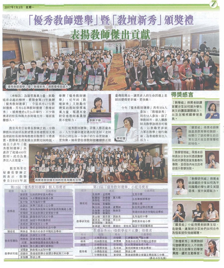 | 2017-07-03 | 優秀教師選舉暨教壇新秀頒獎禮 | 教聯報 |